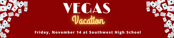 Post reads “Vegas Vacation; Friday, November 14 at Southwest High School”. Background is red with playing cards falling from above